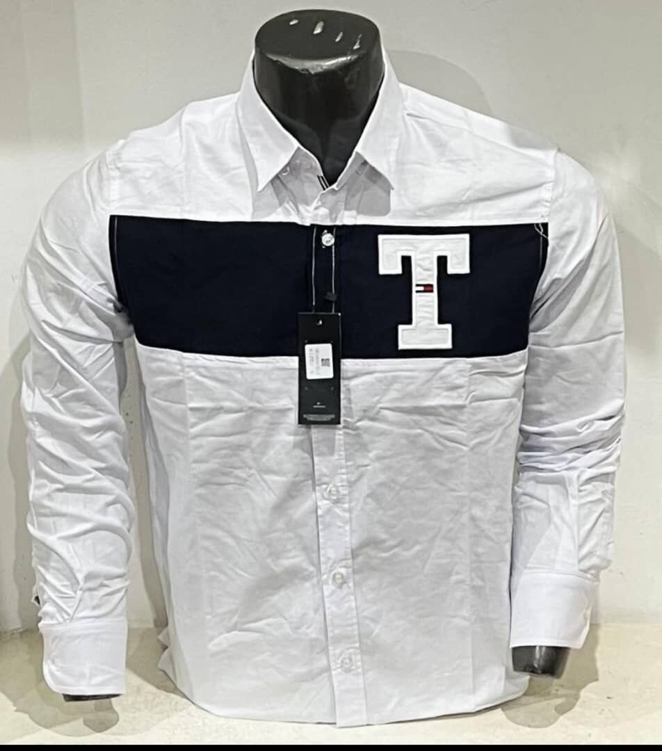 Chemise blanche à manches longues avec motif contrastant en forme de T. Parfaite pour une tenue chic et moderne, elle convient aux occasions formelles et décontractées. Fabriquée avec des matériaux de qualité pour un confort optimal.