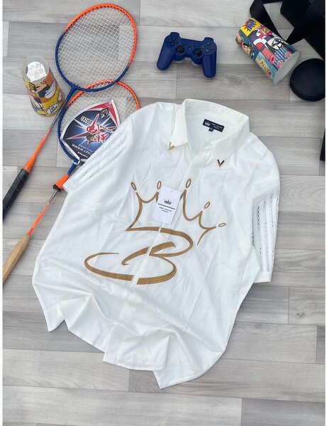 Chemise élégante en noir et blanc ornée d'une couronne dorée. Idéale pour des occasions formelles ou des sorties chics. Confortable et tendance, elle s'associe facilement à votre garde-robe. Parfaite pour ceux qui aiment se démarquer avec style.