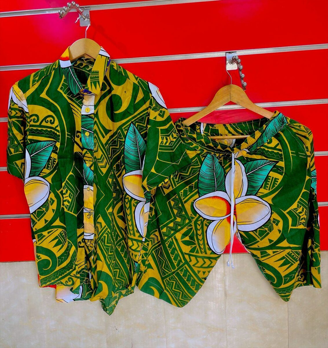 Ensemble chemise et short hawaïens vibrant pour un look tropical et décontracté. Parfait pour des journées ensoleillées à la plage ou pour des vacances exotiques. Offrez-vous un style unique avec des motifs inspirés de la nature.