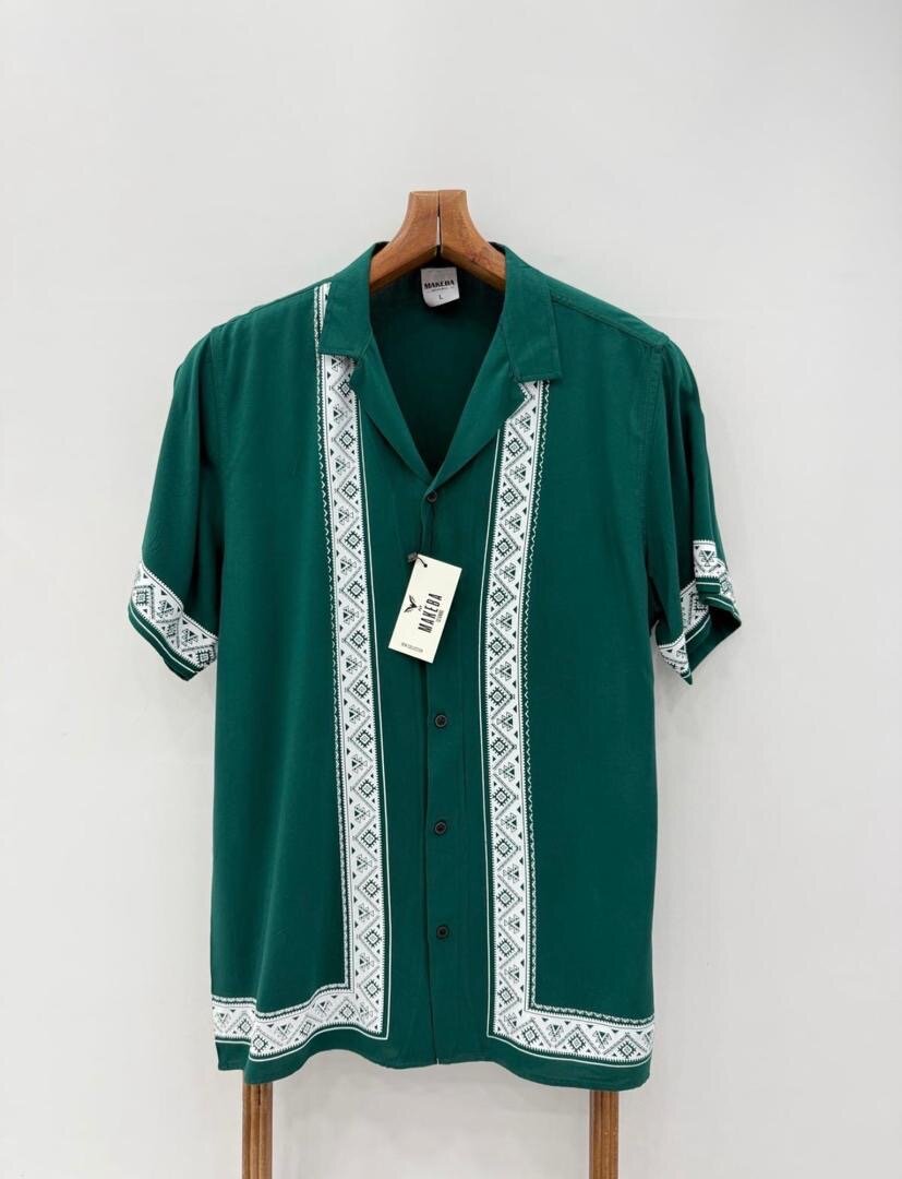 Élégante chemise hawaïenne verte avec motifs géométriques blancs. Parfaite pour une tenue décontractée, idéale pour l'été ou les vacances.