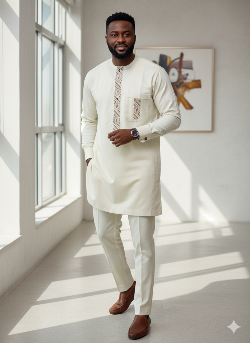 Élégante complet tunique pour homme, avec broderies dorées. Confectionnée avec soin, cette tenue est idéale pour les occasions spéciales ou pour ajouter une touche d'élégance à votre quotidien.