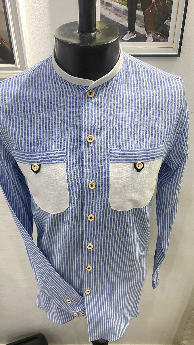 Chemise en Lin bleu ciel Blanc avec des boutons en bois