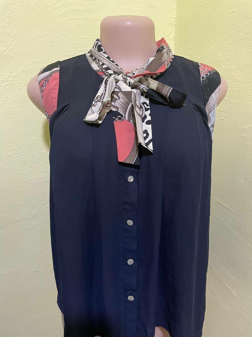 Optez pour cette chemisette sans manches élégante avec col noué pour un look chic et moderne. Parfaite pour le bureau ou une sortie décontractée.