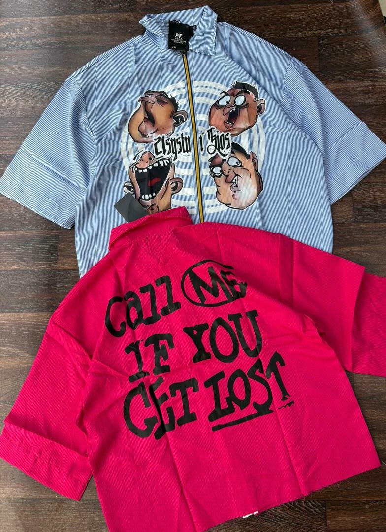 Lot de chemises imprimées pour une expression unique et originale. Une chemise bleu à motifs amusants et une chemise rouge avec message texte. Idéales pour se démarquer avec style.