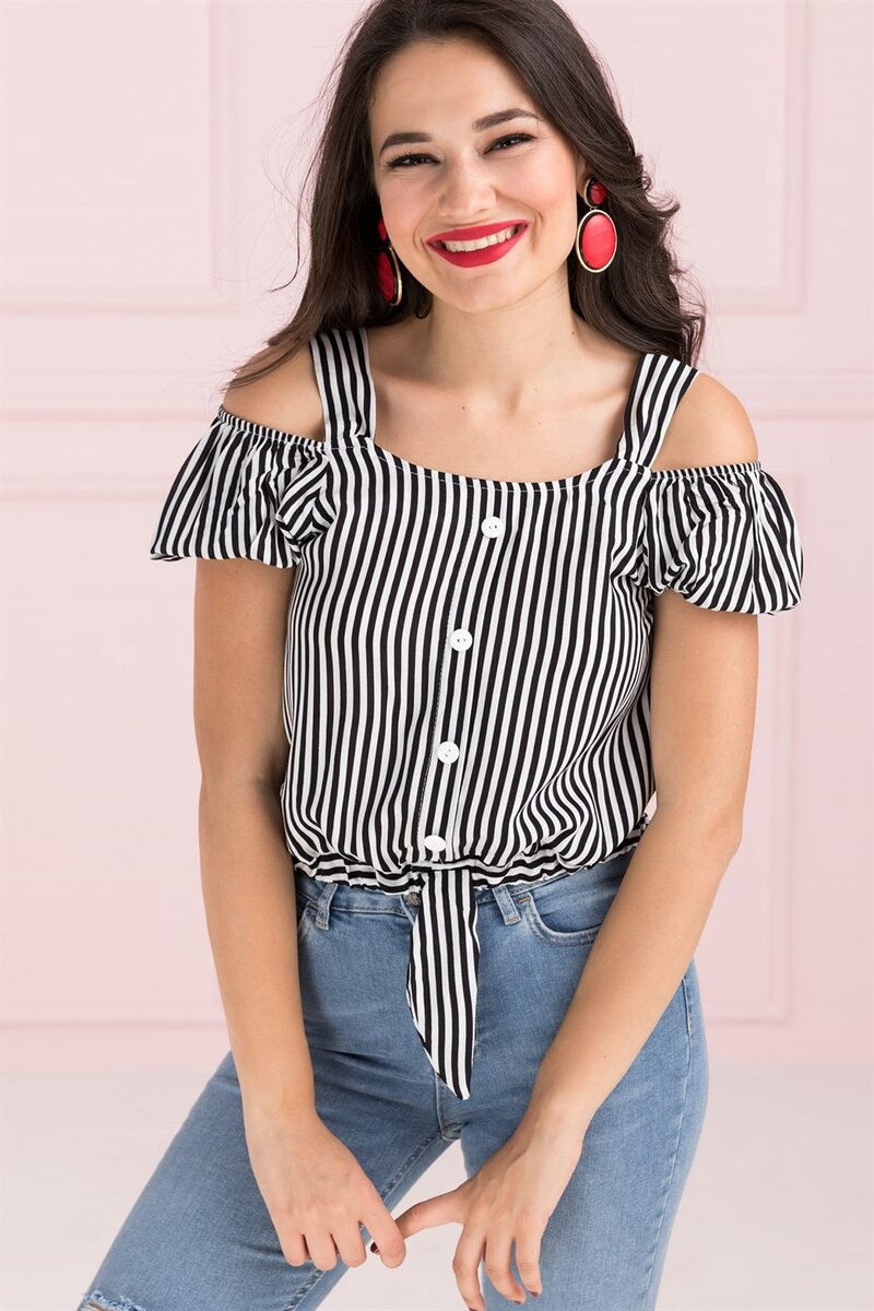 Rehaussez votre style avec ce chemisier chic à rayures à épaules dénudées. Doté de détails de boutons et d'une cravate élégante sur le devant, ce haut est parfait pour des sorties décontractées ou une soirée. Conçu pour le confort et l'élégance, il sera votre choix préféré pour créer des looks à la mode. Idéal pour accompagner de jeans ou de jupes, ce chemisier est un ajout polyvalent à votre garde-robe.