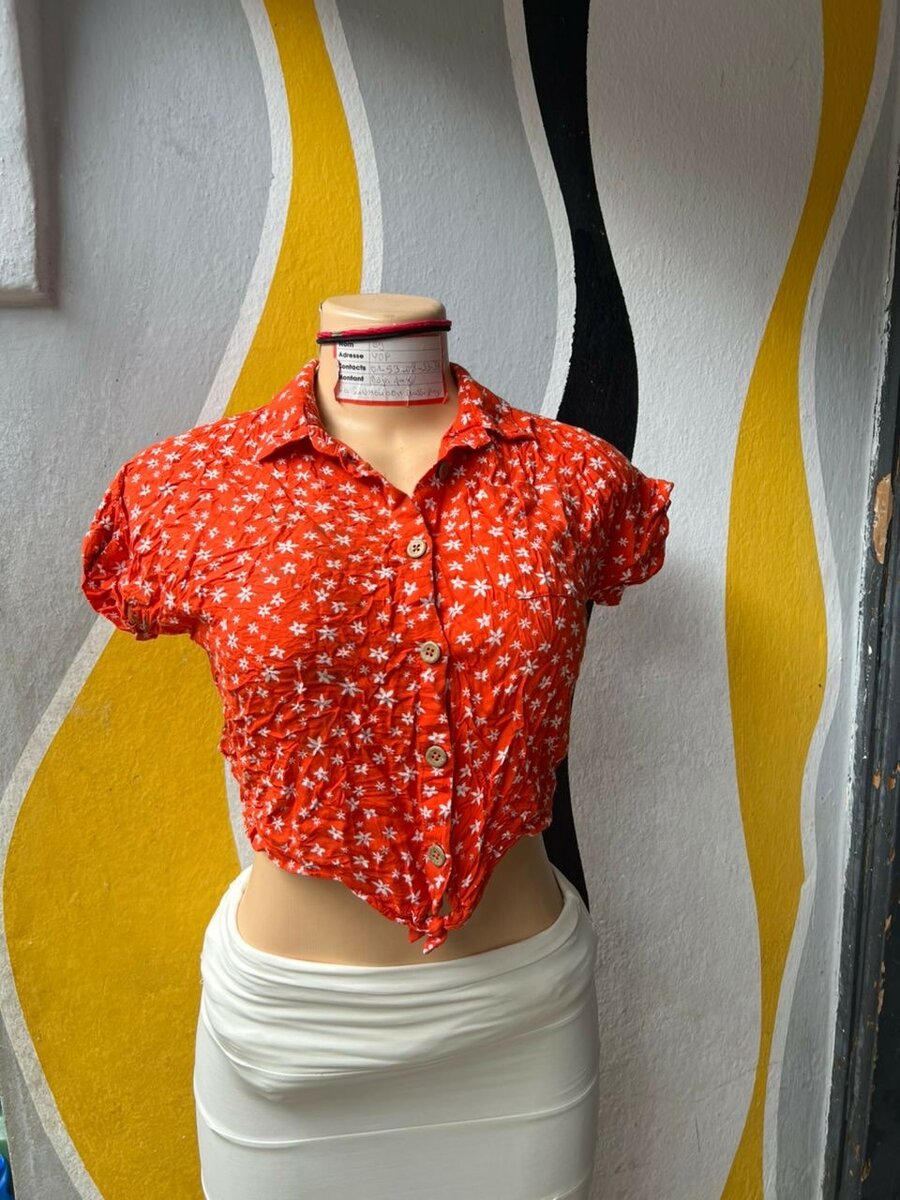 Ajoutez une touche de couleur à votre garde-robe avec ce chemisier rouge à imprimé floral blanc. Parfait pour un look décontracté ou pour apporter une touche d'élégance à votre journée. Léger et confortable, idéal pour toutes les saisons.