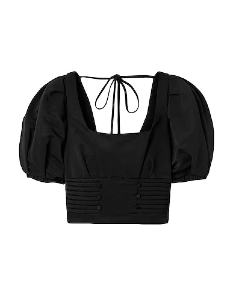 Elevate your style with this chic black top featuring a trendy square neckline and elegant back tie. Perfect for any occasion, this top pairs beautifully with jeans or skirts, offering a versatile look that can be dressed up or down. The unique button detailing adds a touch of sophistication, making it a must-have addition to your wardrobe. Ideal for fashion-forward individuals.