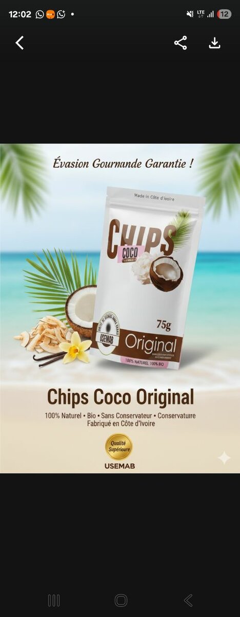 Découvrez nos chips de coco, 100% naturelles et bio. Fabriquées en Côte d'Ivoire, elles sont sans conservateur pour un goût authentique. Parfaites pour une pause gourmande saine et exotique.