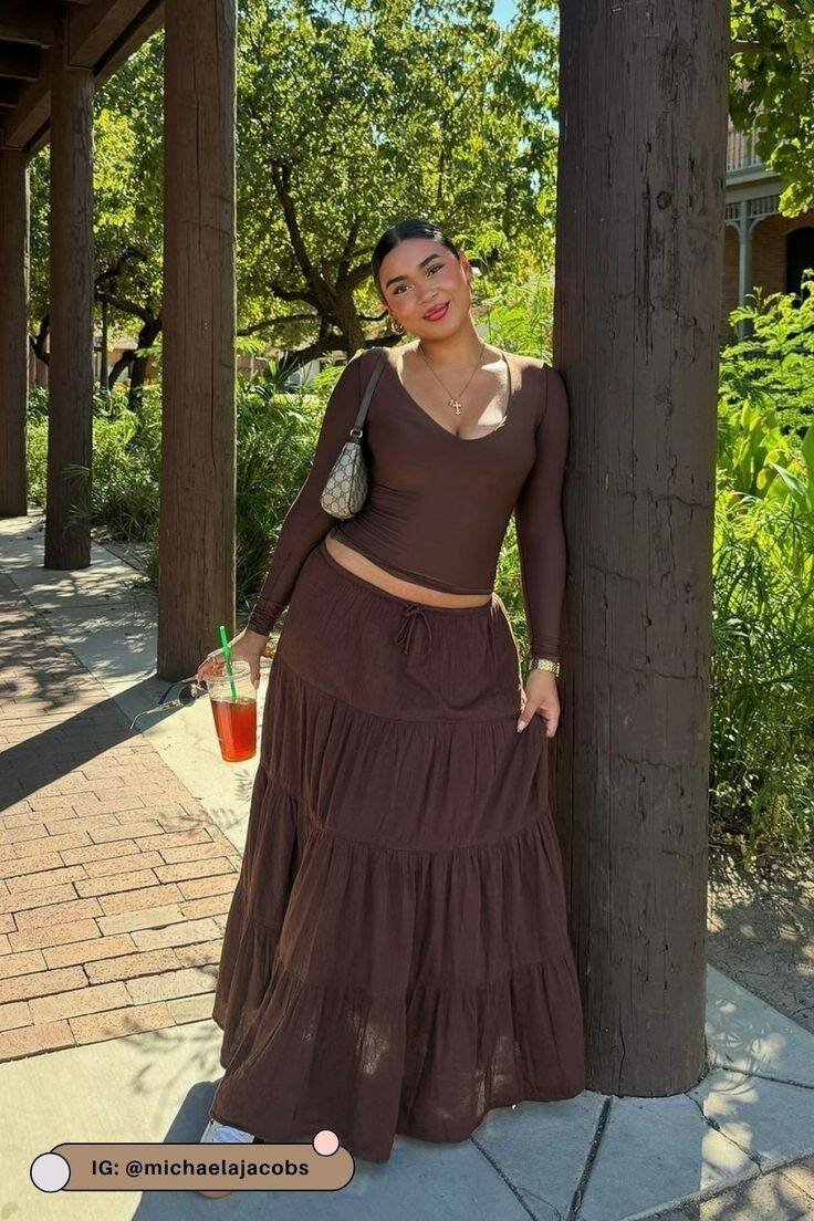 Elevate your style with this elegant chocolate brown maxi skirt. Perfect for casual outings or a relaxed day at the park, its flowing design offers both comfort and chic appeal. Pair with a fitted top for a fashionable ensemble.