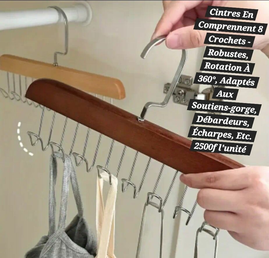 Organisez vos vêtements avec ces cintres robustes équipés de 8 crochets rotatifs à 360°. Parfaits pour soutiens-gorge, débardeurs et écharpes. Design innovant et pratique.
