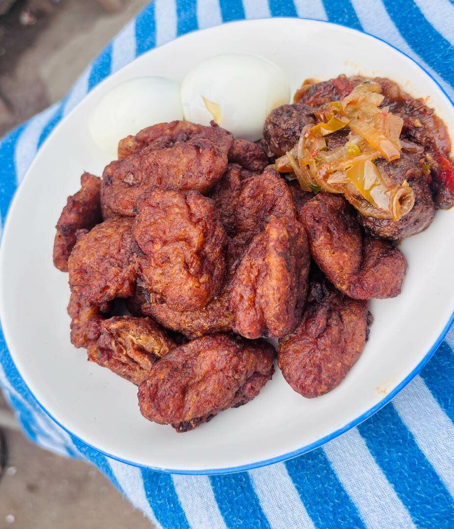 Savourez ces délicieux beignets de banane plantain, parfaitement accompagnés d'œufs durs et d'une sauce piquante. Idéal pour un repas exotique qui séduira vos papilles. Préparé avec des ingrédients frais, ce plat est un parfait mariage de saveurs douces et épicées.