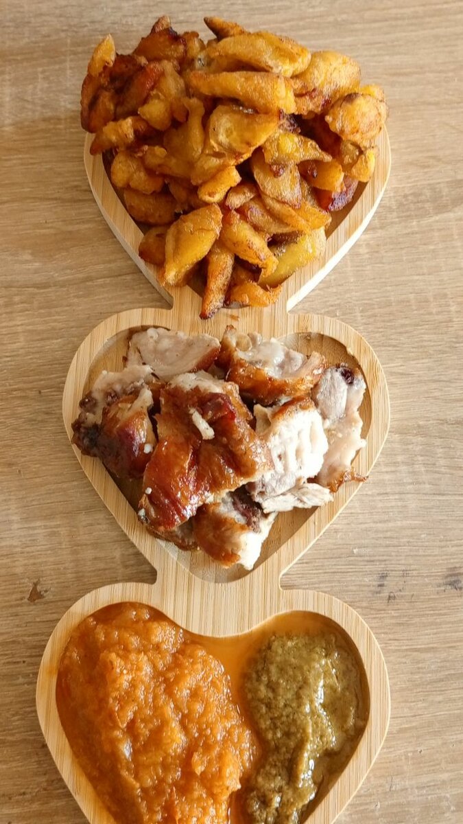 Découvrez notre assiette trio, un mélange savoureux de plantains frits croustillants, de viande rôtie juteuse et de sauces épicées. Parfait pour un repas exotique ou un dîner entre amis. Offrez à votre palais une expérience culinaire unique.
