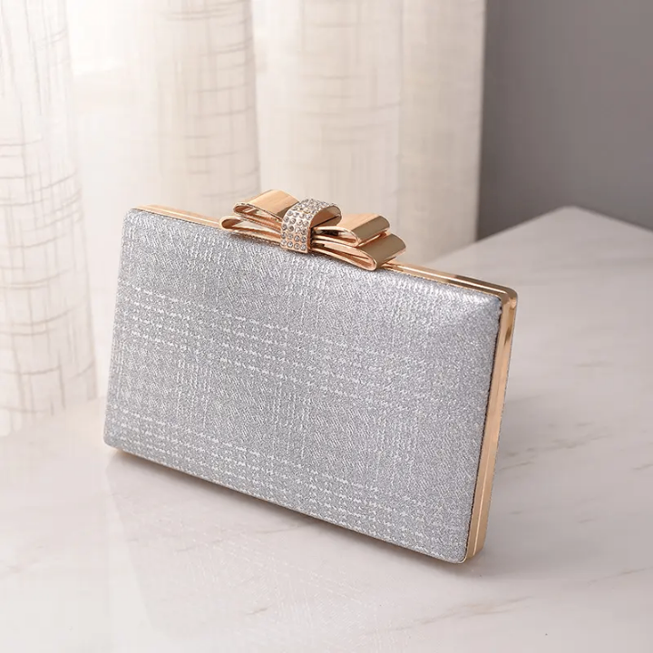 Complétez votre tenue avec ce magnifique clutch argenté, idéal pour les soirées et événements spéciaux. Orné d'un fermoir élégant en forme de nœud, il ajoute une touche de sophistication à votre look. Taille compacte pour transporter vos essentiels avec style.