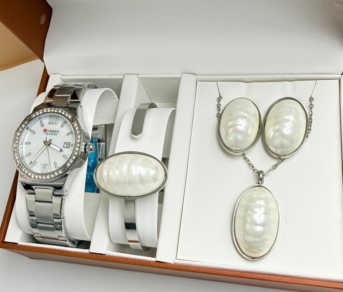 Éblouissant coffret cadeau avec montre argentée étincelante et parures de bijoux en nacre. Idéal pour occasions spéciales, ce set allie élégance et raffinement. Parfait pour les femmes modernes et sophistiquées.