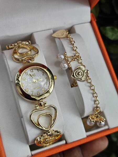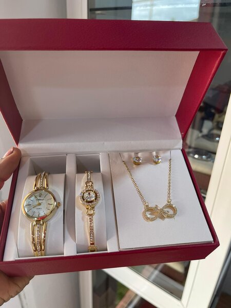 Élégant coffret de bijoux dorés pour femme, comprenant une montre ornée de strass, un bracelet, une bague et des boucles d'oreilles. Idéal pour ajouter une touche de sophistication à vos tenues quotidiennes ou pour des occasions spéciales. Un cadeau parfait pour choyer vos proches.