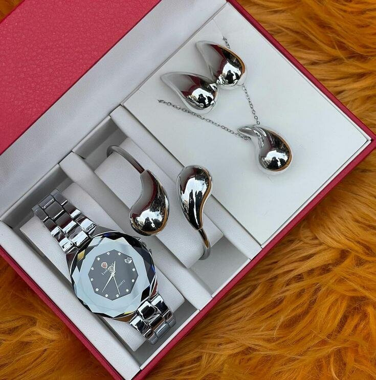 Découvrez notre coffret bijoux pour femme, comprenant montre élégante, bracelet raffiné, collier et boucles d'oreilles assorties. Idéal pour un cadeau mémorable et chic, adapté à toutes les occasions spéciales.