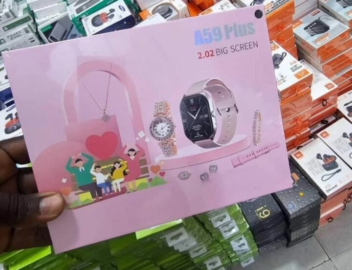 Offrez un ensemble de bijoux et montre A59 Plus avec écran large. Parfait pour un cadeau élégant alliant haute technologie et style sophistiqué. Comprend montre, bracelet et accessoires assortis pour toutes occasions.