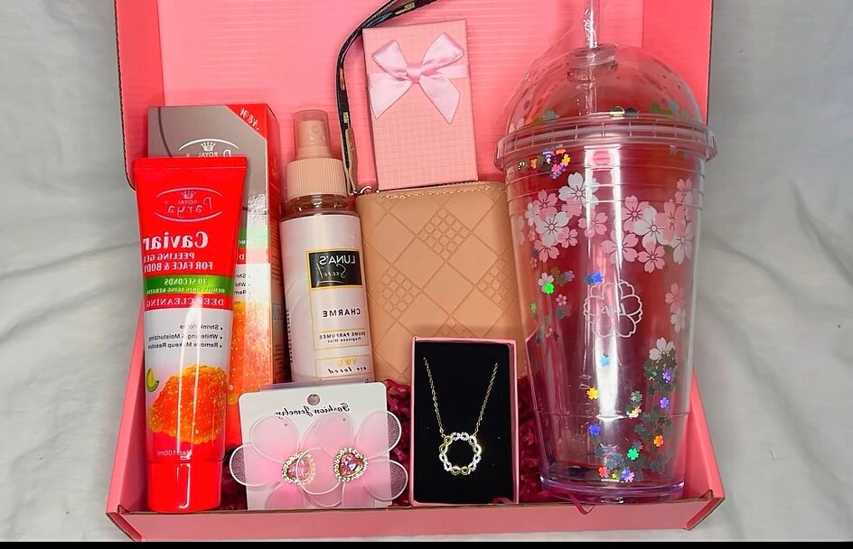 Offrez un coffret élégant contenant des produits de beauté, bijou, pochette et un tumbler floral. Idéal pour surprendre et choyer vos proches.