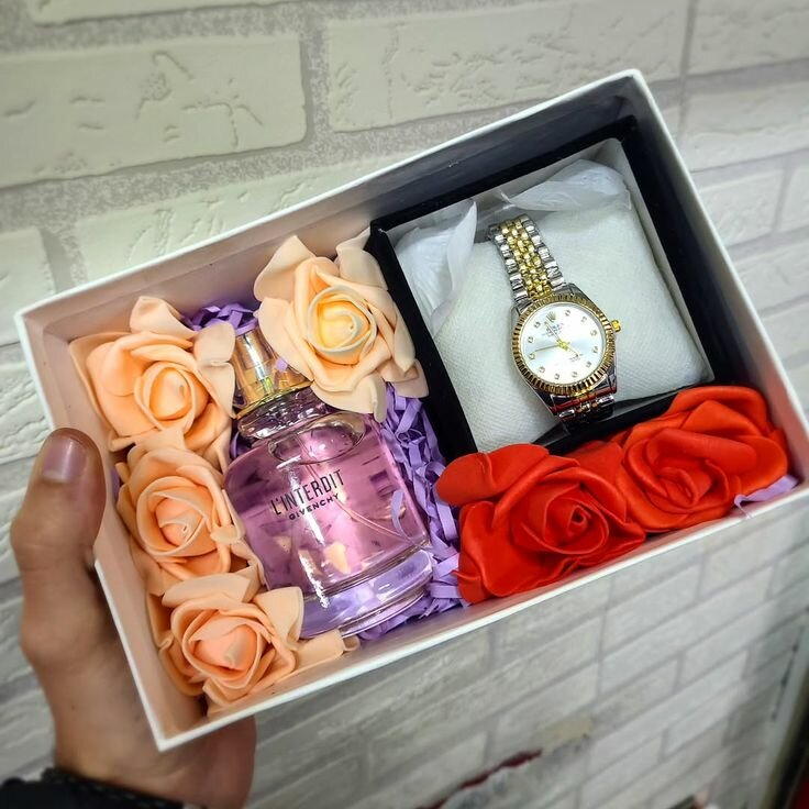 Coffret cadeau élégant avec montre, parfum et roses artificielles. Idéal pour les femmes.