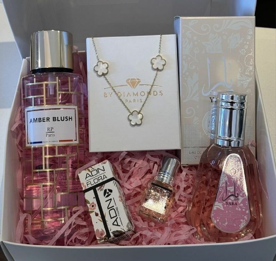 Découvrez notre coffret cadeau parfum femme luxe, comprenant un parfum Ambre Blush, un parfum luxe Yara, un collier BY Diamonds Paris et des produits de beauté Adora. Un cadeau idéal pour les femmes qui aiment la mode et les senteurs luxueuses.