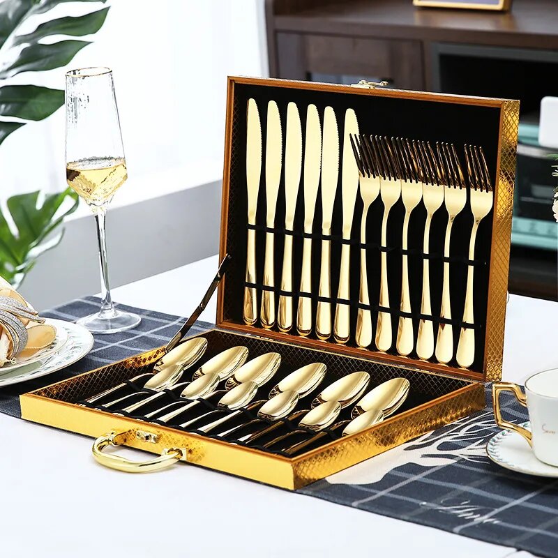 Élevez vos dîners avec notre coffret de couverts en acier inoxydable doré, idéal pour les réceptions et occasions spéciales. Exquis et durable, ce set embellira votre table.