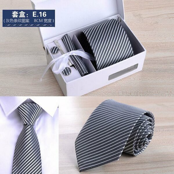 Coffret cravate gris à rayures, accessoires élégants assortis. Style moderne pour l'homme chic.