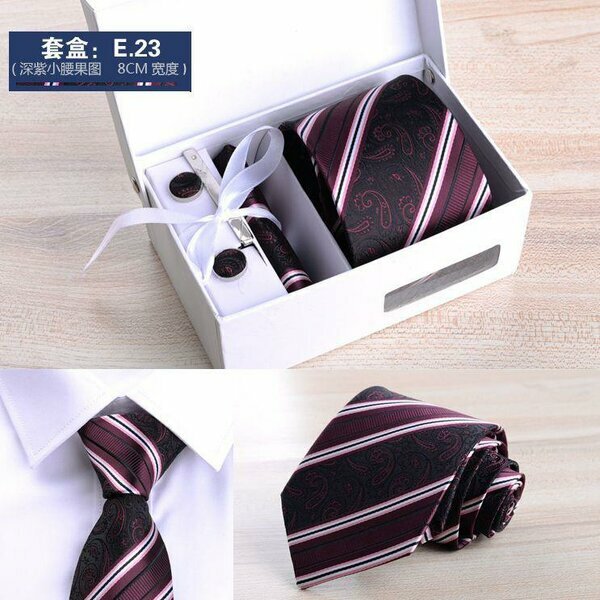 Coffret cravate rayée prune, accessoires en coffret luxe. Parfait pour les événements et bureaux élégants.