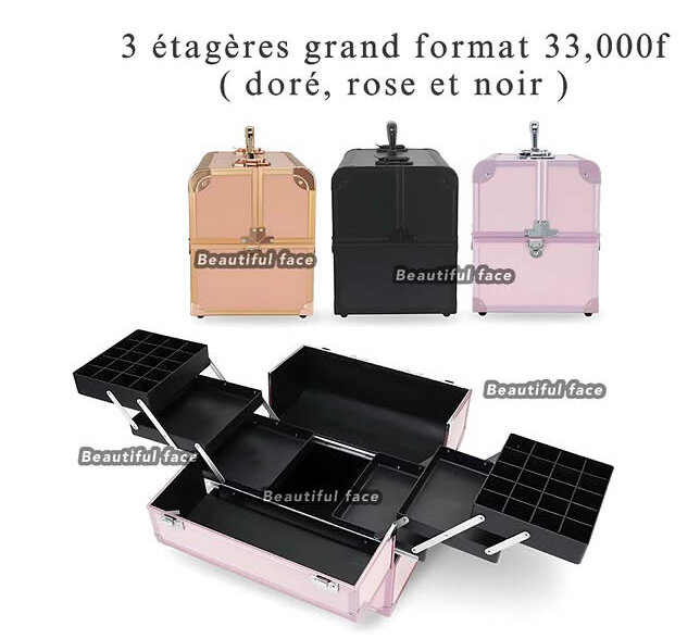 Organisez vos cosmétiques avec style grâce à ce coffret maquillage à 3 étages. Disponible en doré, rose et noir, il est idéal pour garder tous vos accessoires de beauté à portée de main. Parfait pour les professionnels et les amateurs de maquillage.