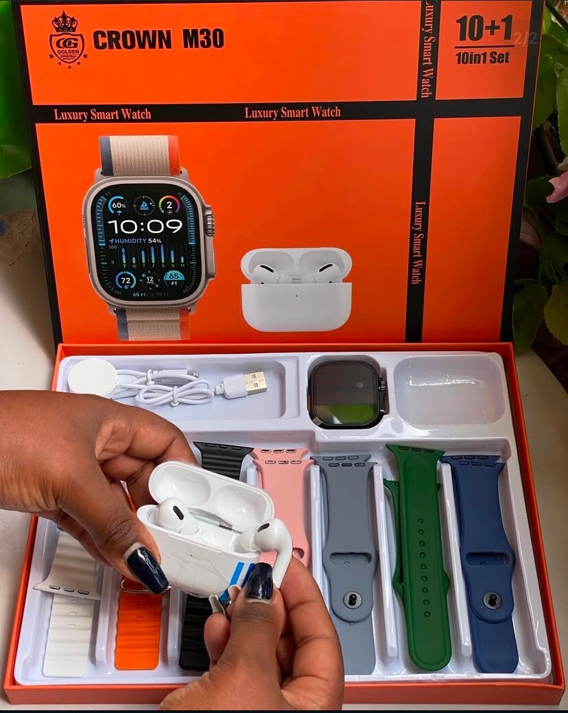 Découvrez le set complet 10+1 avec montre connectée Crown M30 et écouteurs sans fil. Idéal pour suivre votre activité, personnaliser votre style avec six bracelets et profiter de la musique n'importe où. Parfait pour un usage quotidien et pour les amateurs de technologie.