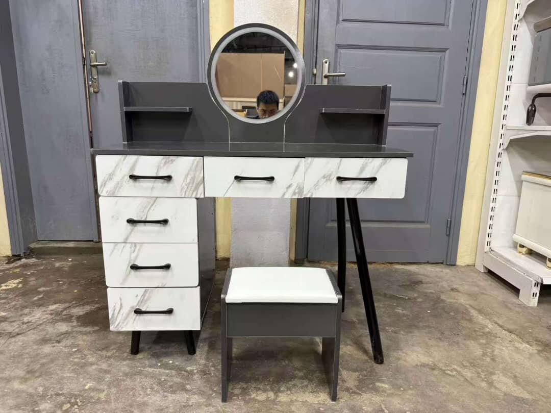 Découvrez cette élégante coiffeuse moderne avec un miroir rond, idéale pour organiser votre espace beauté. Dotée de plusieurs tiroirs, elle offre un rangement pratique pour vos produits cosmétiques et accessoires. Son design chic et ses finitions en marbre ajoutent une touche de sophistication à votre chambre ou salon. Parfait pour ceux qui recherchent à la fois fonctionnalité et style.
