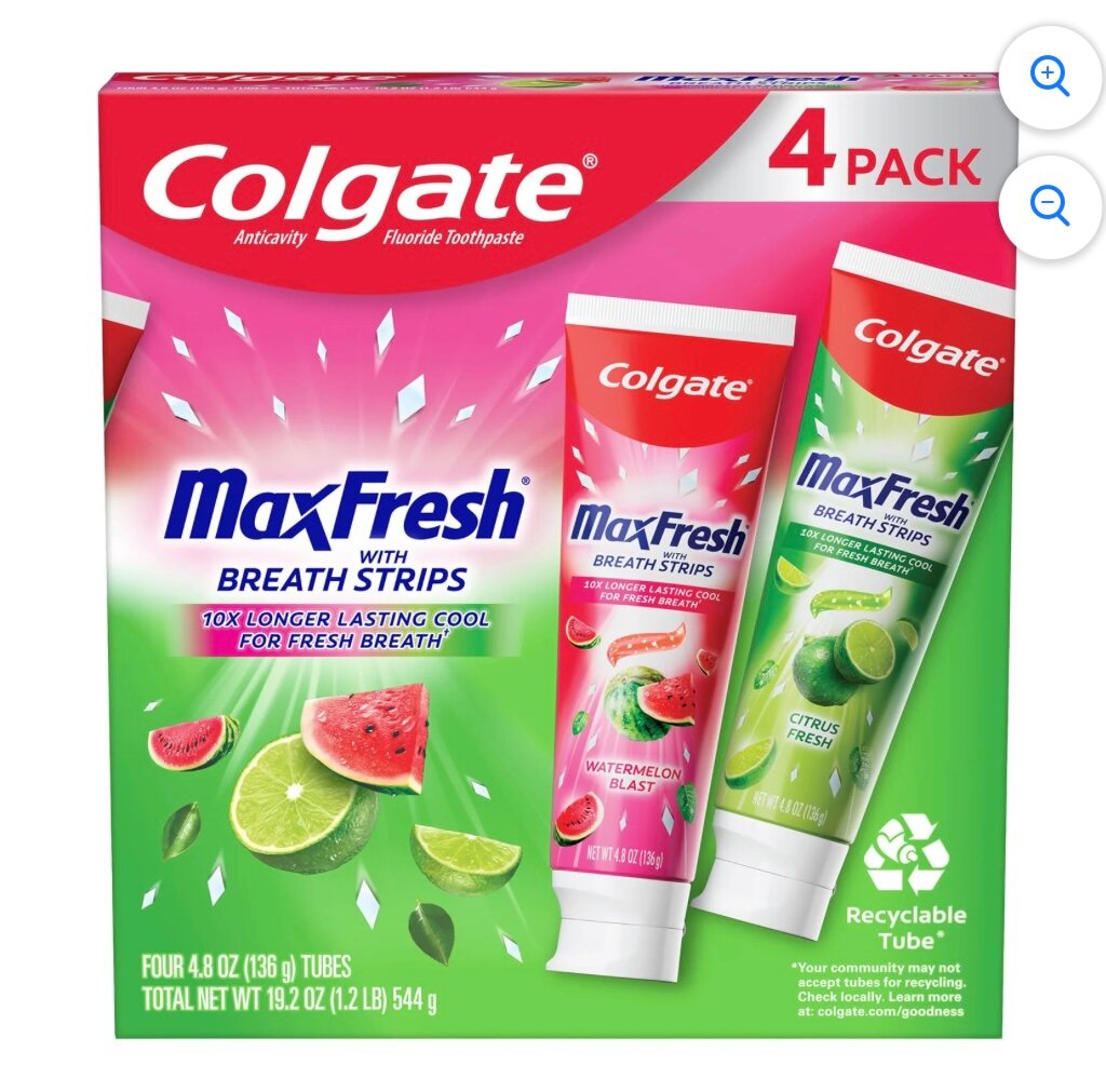 Experience a 10x longer lasting cool freshness with Colgate MaxFresh Toothpaste, now in a convenient 4-pack. Infused with breath strips for superior fresh breath, this toothpaste offers a rejuvenating formula with flavors like Watermelon Blast and Citrus. Ideal for daily oral care, ensuring clean teeth and a vibrant smile with recyclable packaging. Perfect for families seeking effective dental hygiene.