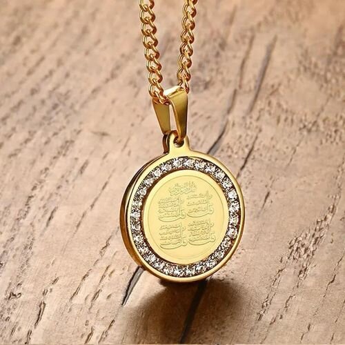Le collier pendentif Allah pour homme en or est en acier inoxydable. Les chaînes sont plaquées or pour une qualité de bijouterie de haute qualité. Un cadeau personnel pour un anniversaire, la fête des pères, la Saint-Valentin, etc.