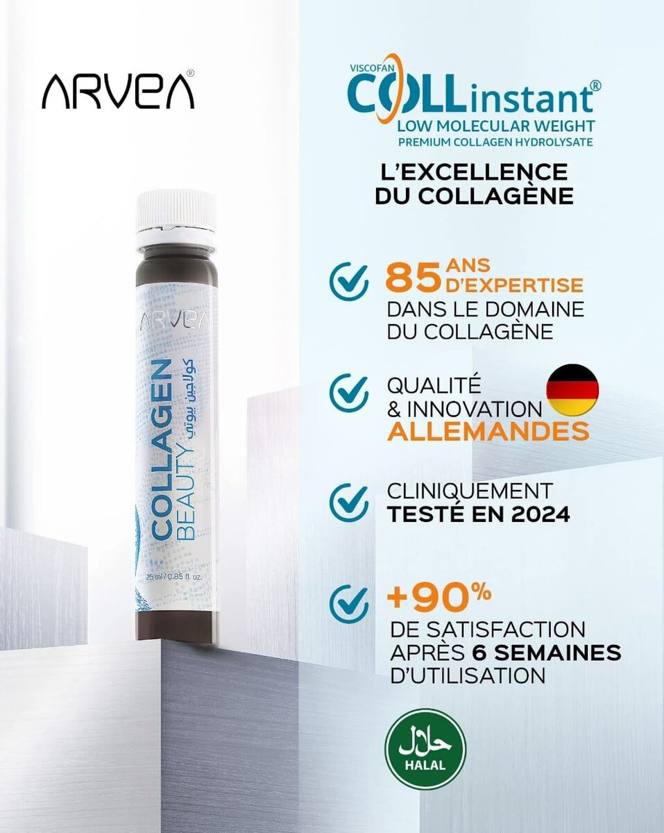 Découvrez l'expertise d'ARVEA avec ce collagène hydrolysé haut de gamme. Clinique allemand, halal et taux de satisfaction de 90 %. Obtenez une peau éclatante en seulement 6 semaines !