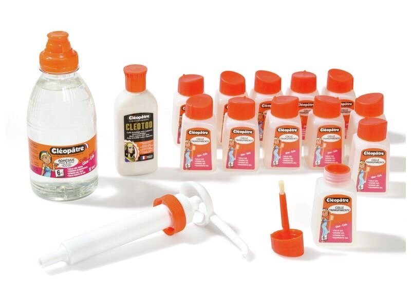 Colle scolaire Cleopatra, idéale pour les projets créatifs des enfants. Comprend plusieurs flacons et accessoires pour une application facile. Parfaite pour l'école et les activités manuelles.
