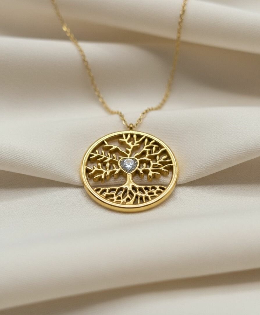 Ajoutez une touche d'élégance et de symbolisme avec ce collier "Arbre de Vie" en or. Parfait pour un look quotidien ou une occasion spéciale. Le pendentif représentant l'arbre de vie symbolise la croissance et la force intérieure, complété par une pierre centrale scintillante. Idéal pour les amoureux de la nature ou comme cadeau significatif. Sa chaîne délicate le rend parfait pour tout décolleté.