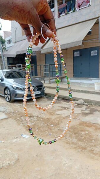 Collier/baya perles pêche, vert et multicolores avec papillon déco. Frais et original, parfait pour se démarquer.
