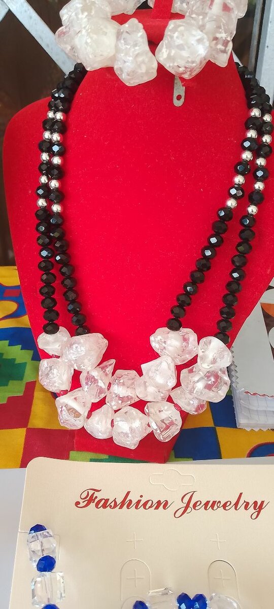 Élégant collier en cristal et perles noires, parfait pour sublimer votre tenue de soirée. Design moderne et sophistiqué qui attire tous les regards.