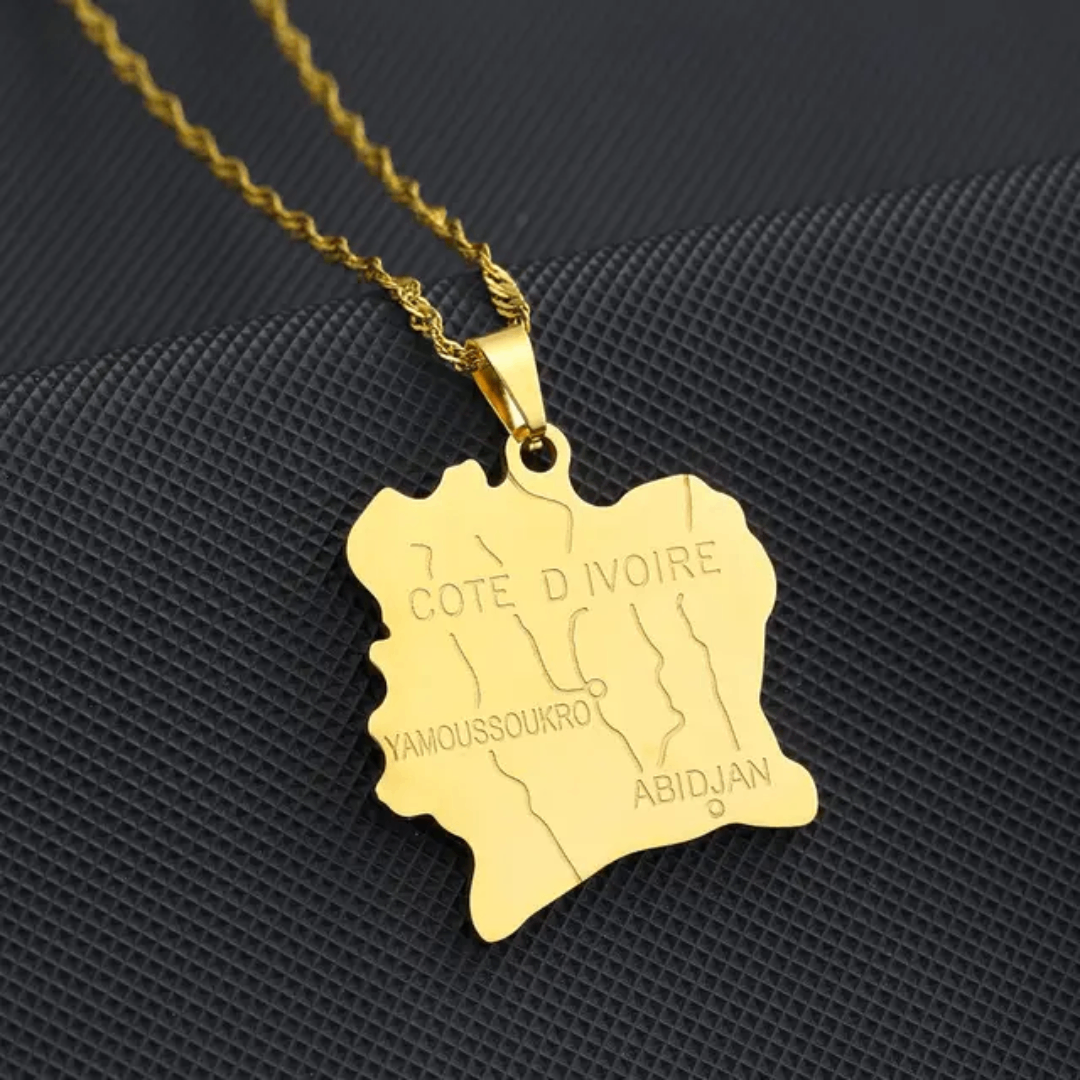 Exprimez votre amour pour la Côte d'Ivoire avec ce superbe collier en forme de carte. Fabriqué avec soin, c'est un accessoire parfait pour tout amateur de bijoux originaux. Convient pour un port quotidien ou comme cadeau spécial.