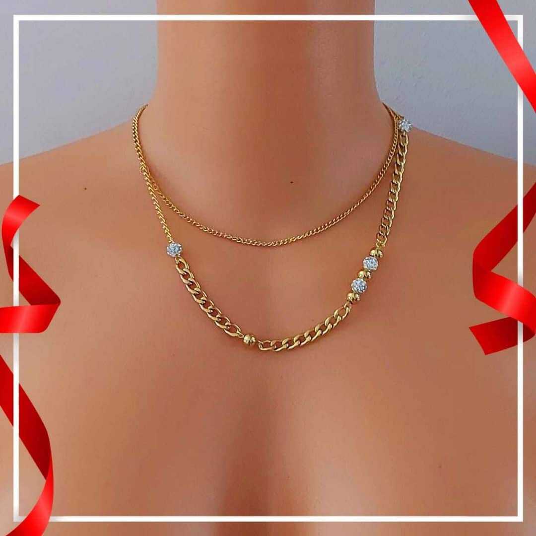 Découvrez cet élégant collier double en or, orné de pierres scintillantes. Idéal pour ajouter une touche de sophistication à n'importe quelle tenue. Parfait pour les soirées spéciales ou comme cadeau raffiné !