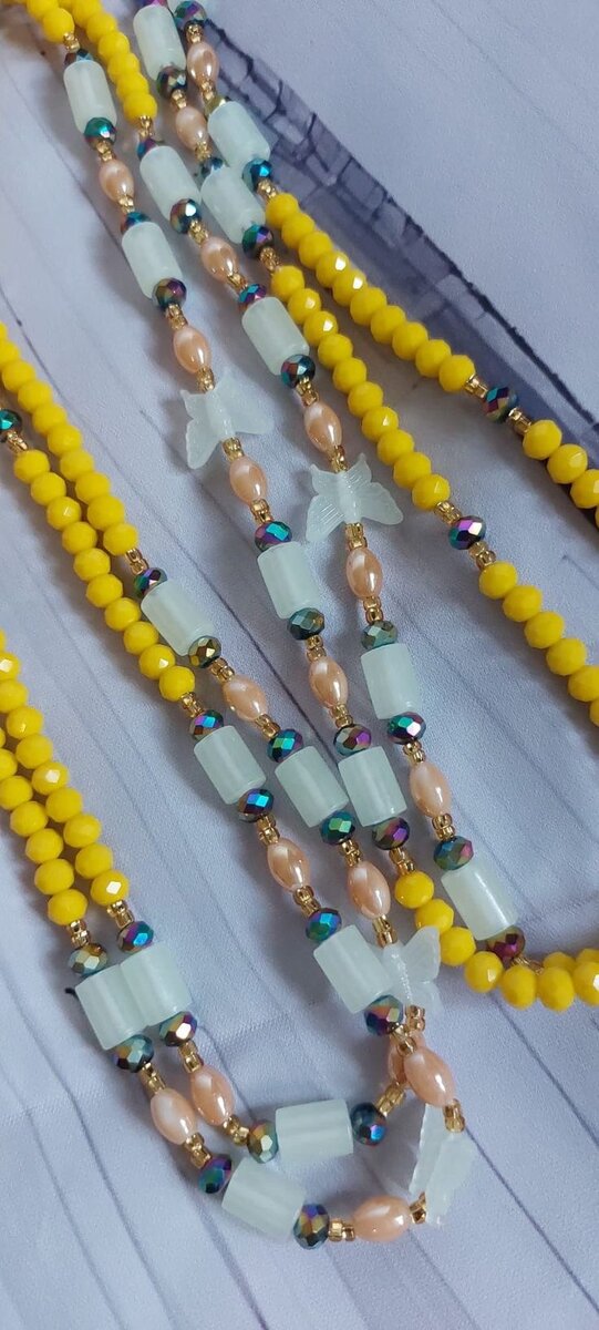 Découvrez ce magnifique collier fait de perles jaunes, blanches et roses. Parfait pour ajouter une touche d'élégance à vos tenues, ce bijou unique est idéal pour les occasions spéciales ou pour un usage quotidien.