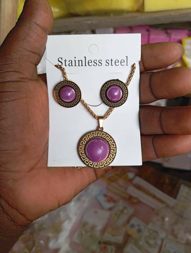 Découvrez cet ensemble élégant en acier inoxydable composé d'un collier et de boucles d'oreilles ornés de pendentifs violets aux motifs grecs. Parfait pour ajouter une touche sophistiquée à n'importe quelle tenue. Durable et résistant à la corrosion.