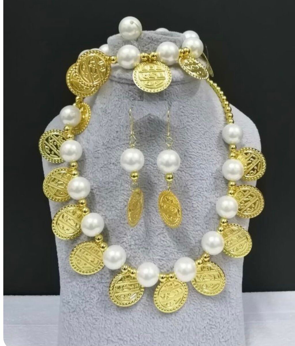 Parfaite touche d'élégance pour vos tenues. Ce set de collier et boucles d'oreilles avec perles et pièces dorées offre un style unique. Idéal pour soirées et occasions spéciales, un choix exceptionnel pour valoriser votre look.