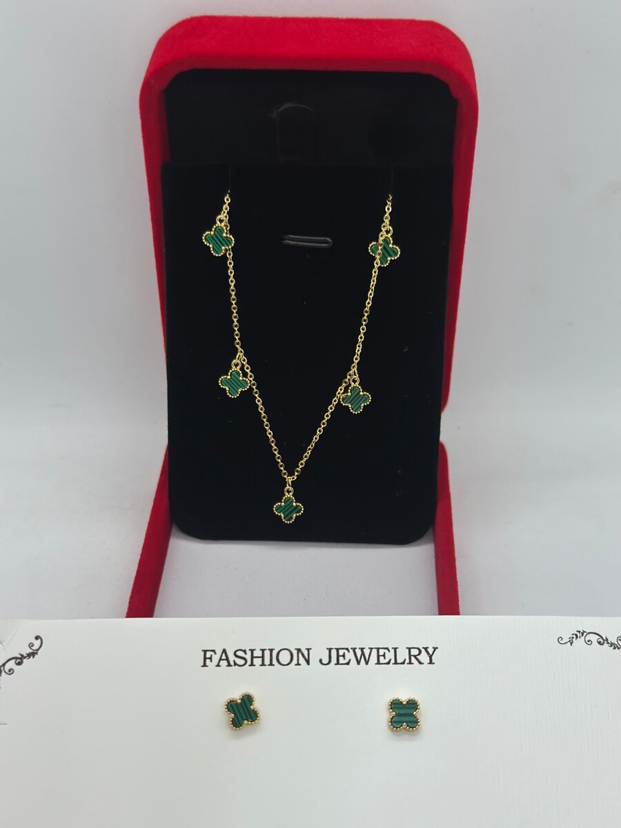Ce magnifique ensemble comprend un collier délicat et des boucles d'oreilles assorties, ornés de motifs de trèfle doré et vert. Parfait pour un look élégant et charmant. Idéal pour les occasions spéciales ou pour ajouter une touche de sophistication au quotidien.