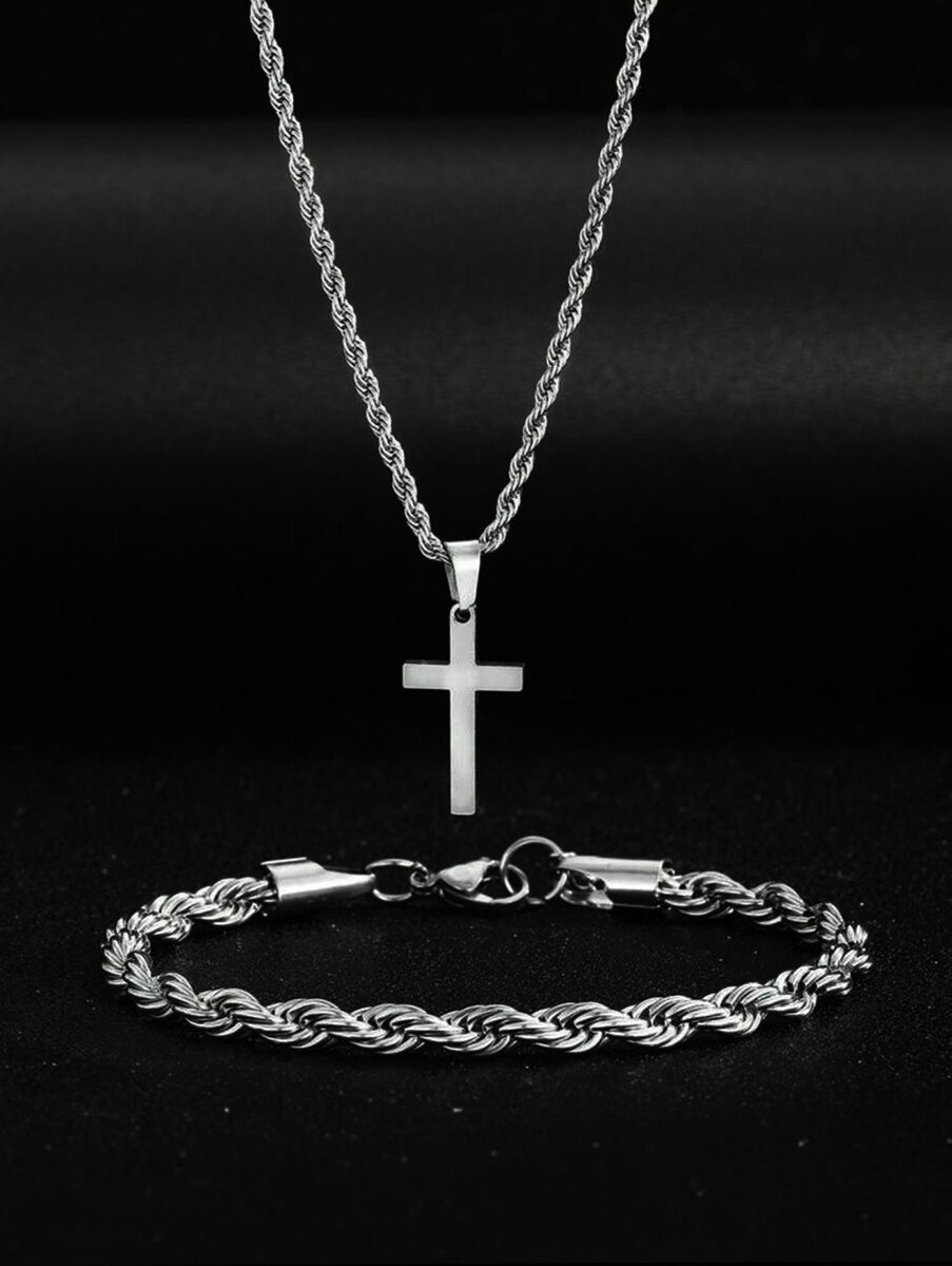 Élégant ensemble collier et bracelet en acier inoxydable avec pendentif croix. Disponible en argent et or, parfait pour un style moderne et sophistiqué. Idéal pour toutes les occasions, ce set ajoute une touche de classe à votre tenue.