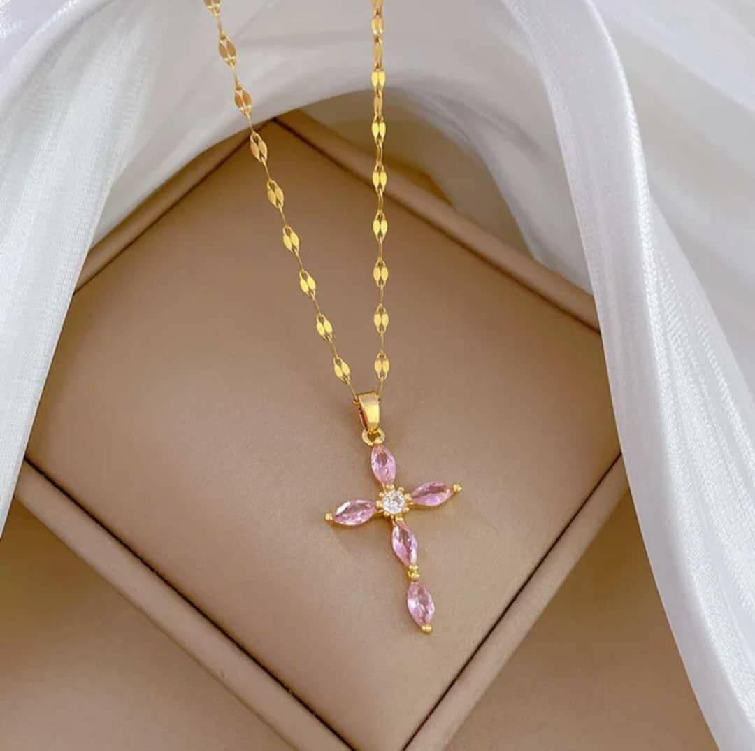 Élégant collier avec pendentif en forme de croix orné de pierres précieuses roses.