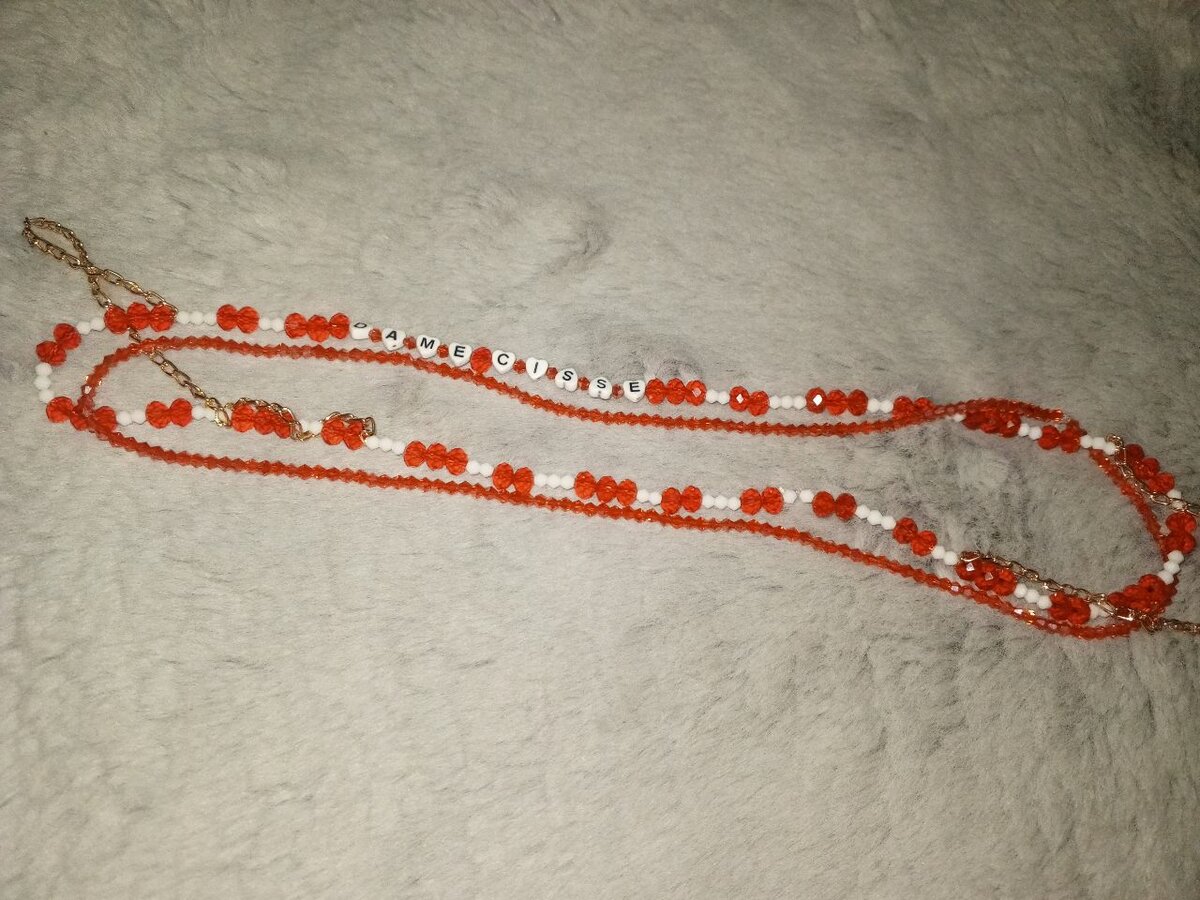 Exprimez votre style unique avec ce collier fait de perles orangées et blanches. Personnalisé avec des lettres pour un message spécial. Idéal pour sublimer vos hanches ou comme cadeau significatif pour son/sa conjoint(e)