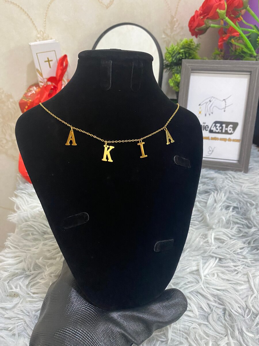 Découvrez le collier personnalisable avec lettres 'AKIA', parfait pour une touche personnelle. Fabriqué en matériau de qualité, il se marie élégamment avec toute tenue. Idéal pour soi-même ou en cadeau.