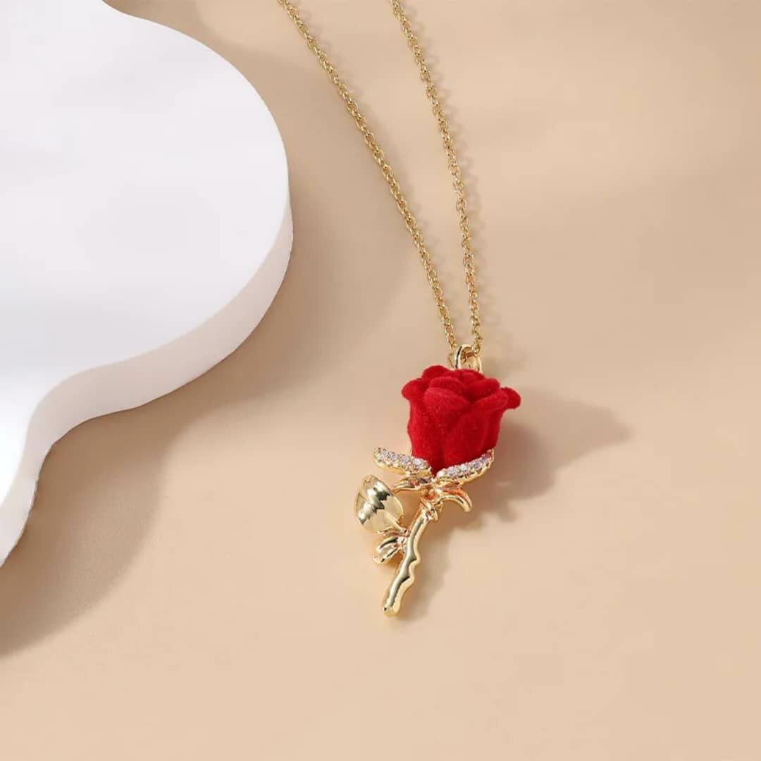 Ajoutez une touche de romantisme à votre tenue avec ce collier raffiné orné d'une rose rouge en velours sur une chaîne dorée. Idéal pour les occasions spéciales ou un cadeau élégant pour une personne chère.