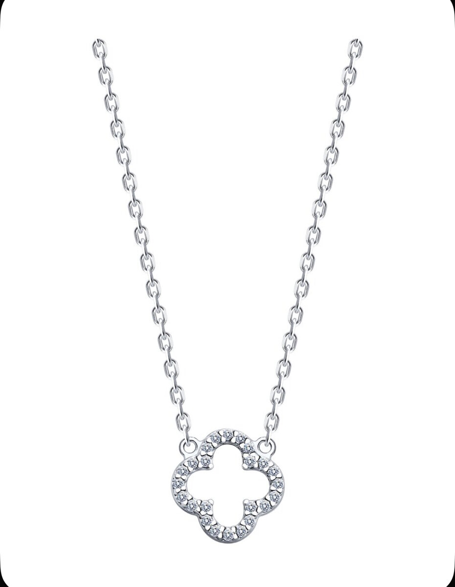 Collier en argent 925 fabriqué en Russie avec un pendentif en forme de trèfle, orné de fianites. Existe également en set avec un bracelet assorti. Livré avec un pochon bleu. Option boîte cadeau.