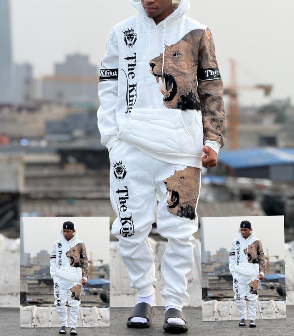 Combinaison blanche avec imprimé lion pour hommes. Confortable et élégante, idéale pour les sorties décontractées ou les activités sportives.
